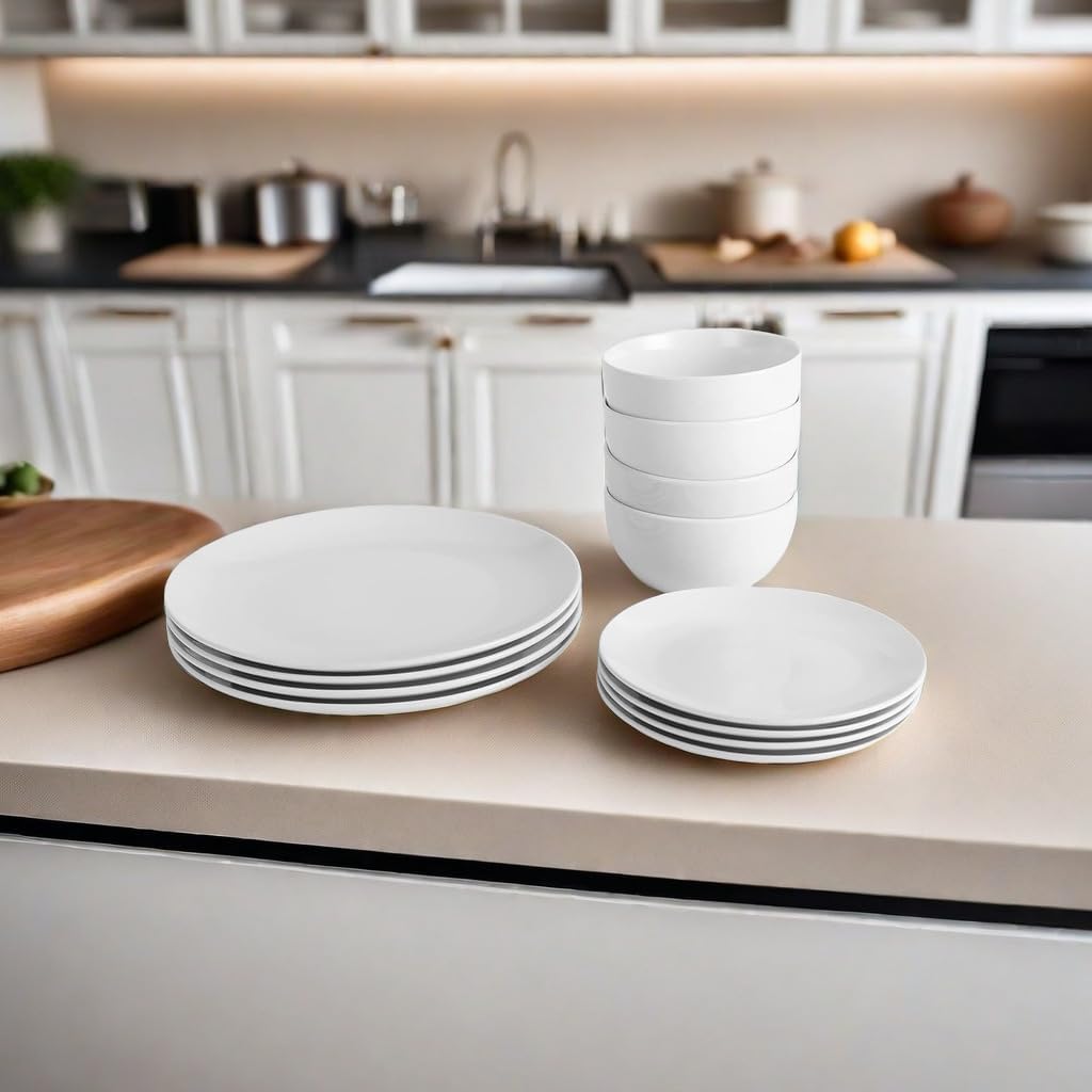 12PC Dinnerware Porcelain White Set: 4 Dinner Plates, 4 Side Plates & 4 Bowls. Dishwasher & Microwave Safe.