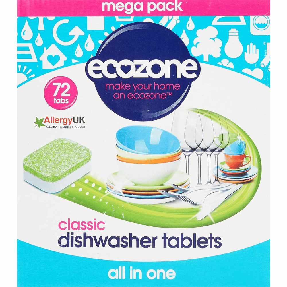 - Ecozone Classic All-In-One Dishwasher Tablets: 72 plant-based eco-friendly dishwasher tablets. Powerful cleaning action leaves dishes, plates, cups, cutlery, pans and glasses shiny and streak free