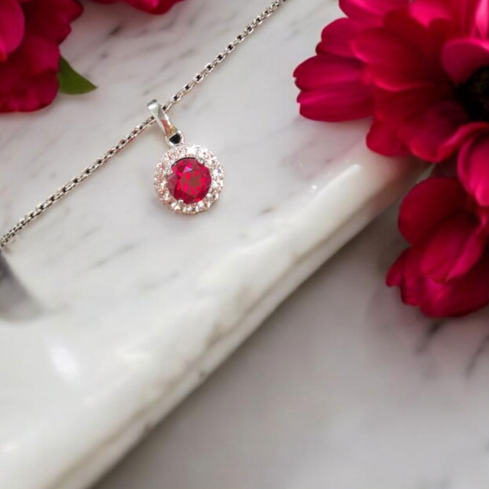 A dazzling ruby pendant encircled by sparkling stones, set on a sleek silver chain—perfect for any occasion.